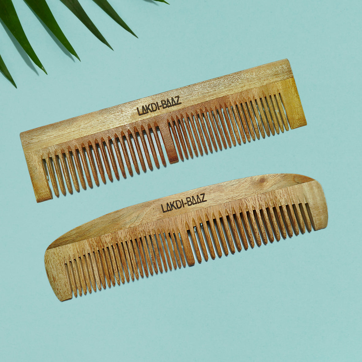 Introducing our Neem Wood Comb Duo – a perfect harmony of nature and functionality. Crafted with precision from the finest Neem wood, this combo features two distinct combs designed to cater to all your hair care needs. The first gem in this set is the Neem Wood Curved-Edge Comb. Its carefully contoured shape is tailored to effortlessly glide through your locks, gently detangling knots and preventing breakage. The curved edges are expertly crafted to follow the natural curve of your head, ensuring a smooth and comfortable combing experience. Whether you have straight, wavy, or curly hair, this comb is your go-to solution for achieving a sleek, polished look with ease. The second companion in this duo is the Neem Wood Wide Comb, offering versatility like never before. With wider teeth, this comb is perfect for handling thicker or textured hair types. Experience a gentle yet effective detangling process, allowing you to style your hair without the worry of damage. The wide comb is also ideal for distributing natural oils evenly, promoting healthier and shinier strands. Both combs are meticulously carved from Neem wood, a material renowned for its natural properties. Neem wood not only provides a luxurious feel but also contributes to the overall health of your hair and scalp. Each comb is a testament to our commitment to sustainability, as Neem wood is a renewable resource, making this combo an eco-friendly choice. Embrace the beauty of simplicity with our Neem Wood Comb Duo – the perfect pairing for achieving effortlessly beautiful hair. Elevate your grooming routine with these handcrafted combs that seamlessly blend style, functionality, and the goodness of nature. Experience the unparalleled luxury of Neem wood as you indulge in the art of self-care with this exquisite comb set.