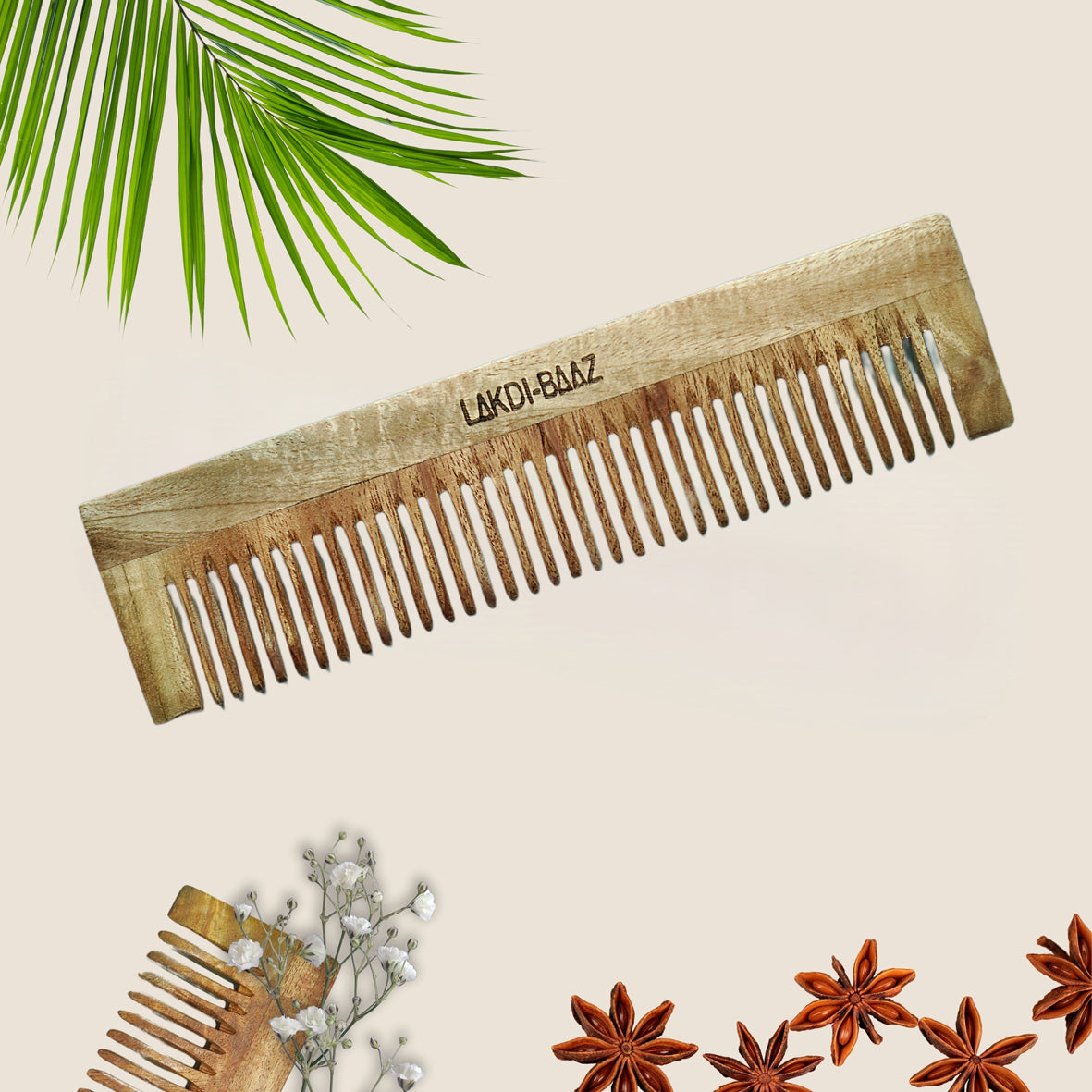 Introducing our Wide Neem Wood Comb – the perfect blend of natural beauty and functional design for your hair care routine. Crafted from premium neem wood, this wide-toothed comb is a luxurious addition to your collection of grooming essentials. Neem wood is renowned for its durability and eco-friendly nature, making it an ideal choice for a comb that cares for both your hair and the environment. The wide-tooth design of our comb is specifically crafted to gently detangle and manage all hair types, whether straight, wavy, or curly. Say goodbye to tugging and breakage, as this comb effortlessly glides through your hair, leaving it smooth and knot-free. The ample spacing between the teeth ensures that even the thickest and most textured hair is treated with the utmost care. The natural variations in the neem wood grain make each comb unique, adding a touch of rustic elegance to your daily grooming ritual. Not only does it look stunning on your dressing table, but it also serves as a sustainable choice for conscious consumers who prioritize eco-friendly alternatives. Neem wood is known for its natural properties, promoting a healthier scalp and hair. Regular use of this wide neem wood comb can contribute to reduced static and enhanced shine, leaving your hair looking and feeling its best. Whether you're a minimalist or a beauty enthusiast, this wide neem wood comb is a must-have accessory for anyone seeking a high-quality, eco-conscious solution to hair care. Invest in the well-being of your hair and the environment with our Wide Neem Wood Comb – a timeless addition to your grooming routine. Order yours today and experience the perfect blend of style, functionality, and sustainability.