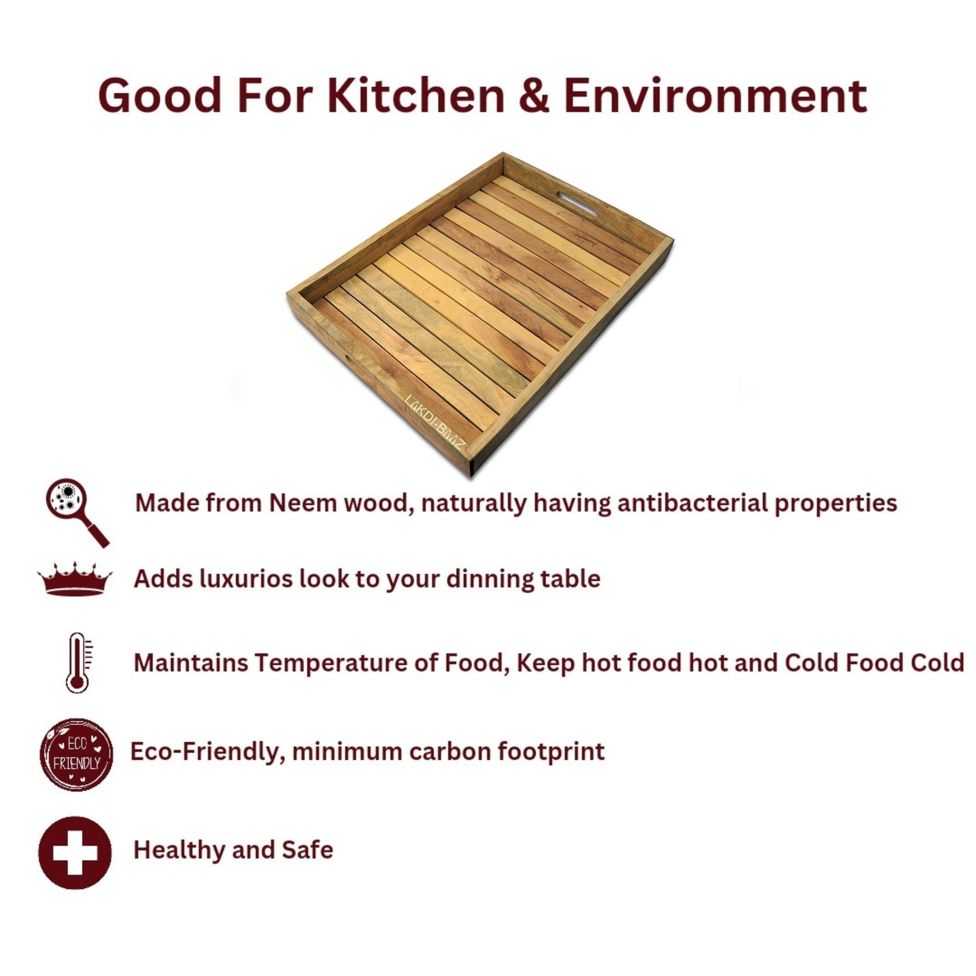 A wooden serving tray made from natural neem wood is the perfect addition to any home or kitchen. The neem tree is a species native to the Indian subcontinent, and its wood is known for its durability and resistance to decay, making it a perfect material for serving trays.