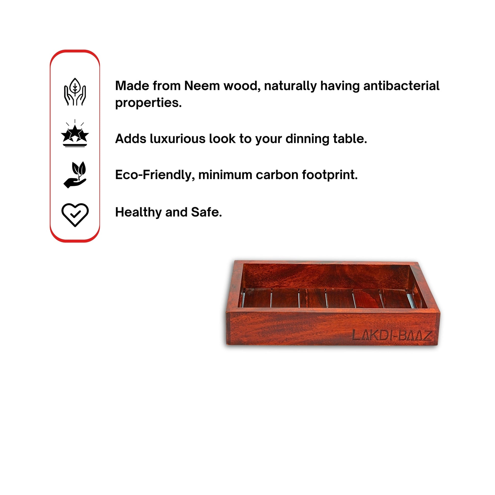 Crafted from premium quality, natural neem wood, this wooden serving tray is a testament to the beauty and durability of wood as a material. Neem wood is known for its strength, resistance to termites, and beautiful grain patterns that add a touch of sophistication to any setting.